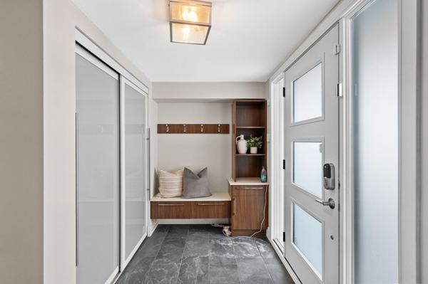 Three bright bedrooms complete this level, including a primary bedroom with custom California Closets built-in storage. Carpet-free living throughout and an upgraded main bathroom with double sinks and a tub/shower combination with glass door complete the space.
